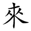 [①][lái][《廣韻》落哀切,平咍,來。]“倈1”的今字。“来1”的繁体字。(1)小麦。(2)引申泛指五谷之穗。(3)由彼及此;由远到近。与“去”、“往”相对。(4)回来,返回。(5)特指已嫁女子回娘家省亲。(6)归服;归顺。(7)后多作“徠”。招致;招揽。(8)产生;开始;发生。(9)未来,将来。(10)指次于今年、今天的。参见“來年”、“來早”。(11)往昔,过去。(12)以来,表示时间从过去某时持续到现在。(13)指来孙。(14)犹言一样、一般。表示比况。(15)由来。从发生到现在。(16)由来。事物发生的原因。(17)表示做某个动作。(18)用在动词或动词结构前面,表示要做某事。(19)用在另一动词或动词结构后面,表示来到某处做某事。(20)用在两个动词或动词结构中间,表示前者是方法、态度,后者是目的。(21)用在动词后面,表示动作的趋向。(22)用在动词后面,表示动作的结果。(23)用在形容词后面,表示程度。(24)用作词尾,表示一段时间。相当于“的时候”。(25)同“不”连用,表示不可能。(26)同“的”或“得”连用,表示可能。(27)用在“一、二、三”等数词之后,表示列举理由。(28)用在数词或量词后面表示概数。(29)助词。相当于“是”。表示宾语前置。(30)助词。相当于“得”。(31)语助词。用在句中或句末,表示祈使语气。(32)语助词。用在句中或句末,表示陈述语气。相当于“咧”。(33)语助词。用在句末,表示疑问语气。(34)语助词。用在句中,表示停顿,带有假设之意;或对举,则带有两难之意。(35)语助词。用在句中作衬字。(36)木名。“即来”的省称。(37)姓。汉有来歙。见《後汉书》。[②][lài][《集韻》洛代切,去代,來。]“来2”的繁体字。(1)慰劳;劝勉。(2)通“賚”。送给;赐予。