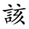 [①][gāi][《廣韻》古哀切,平咍,見。]“该1”的繁体字。(1)具备;充足。(2)包容;包括。(3)广博。(4)宽大。参见“該放”、“該宥”。(5)有;拥有。(6)承受。(7)命运注定。(8)应当;理应如此。(9)大概,估计情况应该如此。(10)用于感叹句中以加强语气。(11)相当于,折合。(12)管理。(13)约束。(14)轮值,值班。(15)轮到。(16)欠。(17)代词。指上文说过的人或事物(多用于公文)。(18)方言。此;这。(19)方言。关,相干。(20)通“咳1”。参见“該該”。