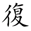 [①][fù][《廣韻》房六切,入屋,奉。][《廣韻》扶富切,去宥,奉。]“复1”的繁体字。(1)还,返回。(2)抵偿;偿还。(3)谓归还。参见“復政”。(4)恢复;康复。(5)收复;光复。(6)重复;反复;回环。(7)告诉;回答;回复。(8)又;更;再。(9)报复。(10)谓实践诺言。(11)谓免除徭役或赋税。(12)泛指消除。(13)古丧礼称召唤始死者的灵魂为“復”。(14)通“覆”。庇护;覆盖。(15)通“覆”。倾覆;颠覆。(16)通“”。地室。《诗·大雅·绵》:“古公亶父,陶復陶穴,未有家室。”復,《说文·穴部》引作:“”。《商君书·徕民》:“人之復陰陽澤水者過半。”朱师辙解诂:“復借为'',地室也。”一说为开掘於住穴之内的窦窖。参阅于省吾《泽螺居诗经新证·陶复陶穴》。(17)通“腹”。丰厚。(18)通“複”。参见“復道”、“復格”。(19)卦名。六十四卦之一,震下坤上。(20)姓。春秋楚有復遂。见《左传·文公十年》。