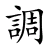 [①][tiáo][《廣韻》徒聊切,平蕭,定。]“稠2”的被通假字。“调1”的繁体字。(1)协调;使协调。(2)适合,符合。(3)调和;调配。(4)调停使和解。参见“調停”、“調處”。(5)调试;调弄;演奏。(6)调剂。(7)调理,调养。(8)治理。(9)驯养,训练。(10)驯顺。(11)戏弄;嘲笑。(12)挑逗;逗引。(13)挑拨,挑唆。参见“調脣”、“調唆”。(14)欺骗。参见“調欺”。(15)抛掷,扔。(16)见“調調”。[②][diào][《廣韻》徒弔切,去嘯,定。]“调2”的繁体字。(1)戏曲和歌曲的乐律;调子。(2)指诗的韵律、气韵。(3)指人的志向,志趣。(4)才情,才调。(5)说话、读书等的腔调。(6)指语音上的声调。(7)指言辞。(8)选调;迁转;更动(工作、位置)。(9)征调,征发。(10)转动。(11)调换。(12)用同“掉”。摆弄。(13)掉,落。(14)准备,置办。(15)计算。(16)古代赋税的一种。汉末、魏晋有户调,唐代有租、庸、调。[②][zhōu][《廣韻》张流切,平尤,知。]“调3”的繁体字。朝,早晨。