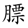 [①][piǎo][《廣韻》苻少切,上小,滂。][《廣韻》子小切,上小,精。]亦作“膔2”。牲畜小腹两边之肉。[②][biāo][《集韻》紕招切,平宵,滂。]亦作“脿1”。亦作“臕1”。(1)畜兽肥壮或其肥壮之处。(2)指人肥壮。(3)方言。聚精会神;盯住或缠住不放。(4)用同“鰾”。鱼类体内可胀缩的囊状物。