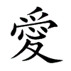 [①][ài][《廣韻》烏代切,去代,影。]“爱1”的繁体字。(1)待人或物的深厚真挚感情。(2)指具有深厚真挚的感情。(3)仁惠。(4)喜欢,爱好。(5)指所喜爱的人。(6)仰慕。(7)爱护,关心。(8)怜惜;爱惜。(9)舍不得;吝惜。(10)指男女间之爱恋。(11)容易发生某种变化;常常发生某种行为。(12)对别人的女儿的尊称。(13)通“薆”、“”。隐蔽;障蔽。(14)通“曖”。参见“愛景”。