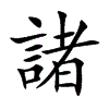 [①][zhū][《廣韻》章魚切,平魚,章。]“诸1”的繁体字。(1)辩,问辩。(2)别事词。相当于“者”。(3)众;各个。(4)凡是。(5)别的;其他。(6)犹庶。亲属的旁支。(7)代词。相当于“之”。用作宾语。(8)代词。相当于“其”。用作定语。(9)介词。相当于“於”。(10)语助词。表感叹。(11)语助词。用于句中。(12)代词“之”和介词“於”的合音。(13)代词“之”和疑问语气词“乎”的合音。(14)干果。(15)通“都”。参见“諸頭”、“諸邊”。(16)古邑名。春秋鲁地。在今山东省诸城县西南。(17)姓。《广韵》又正奢切,職余切。汉代有诸於。见洪迈《容斋五笔》引汉应劭《风俗通》。[②][chú][《字彙》常如切]“诸2”的繁体字。蟾蜍。
