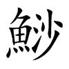[①][shā][《廣韻》所加切,平麻,生。]亦作“魦1”。亦作“鯋1”。“鲨1”的繁体字。(1)吹沙鱼。又名鮀。生活在溪涧的小鱼。(2)一种生活在海中的鳃裂位于侧面的板鳃鱼类的通称。又名沙鱼或鲛。种类很多,性凶猛,捕食其他鱼类。肉可食,肝可制鱼肝油,鳍干制成鱼翅,是名贵食品,皮可制装饰品或刀鞘。