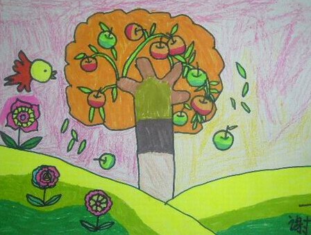 秋天到了,苹果树上挂满了一个个又大又红的苹果。远远望去,就像一盏盏红红的小灯笼。