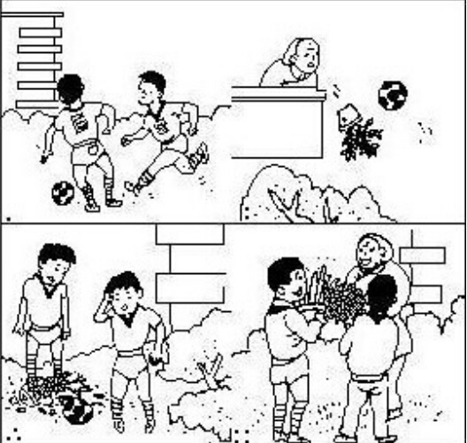 这时,小明用他的右脚使劲一踢,结果足球踢到了二楼的窗台上,把花盆踢了下来。老奶奶听见“啪”的声音,急忙赶到窗台上一看,只见花盆碎了,老奶奶火冒三丈地说:“这是哪个调皮的小朋友干的?”