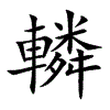 [①][lín][《廣韻》力珍切,平真,來。]“辚1”的繁体字。(1)象声词。(2)车轮。(3)门槛。[②][lìn][《廣韻》良刃切,去震,來。]“辚2”的繁体字。辗轧;践踏。