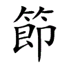 [①][jié][《廣韻》子結切,入屑,精。]“节1”的繁体字。“卩1”的今字。(1)竹节。(2)泛指草木条干间坚实结节的部分。(3)骨节。人身及动物骨骼联接的部分。(4)事物的一端为一节。(5)泛指事项。(6)量词。(7)节令;节日。古以立春、立夏、立秋、立冬及春分、秋分、夏至、冬至为八节;后分一年为二十四节。(8)时期。(9)符节。古代使臣所持以作凭证。(10)气节;节操。(11)志节;志向。(12)礼节。(13)法度;法则。(14)节制;管束。(15)节约;省俭。(16)减除。(17)指删节。(18)一种古乐器。用两圆竹编成,上合下开,形似箕,可以拍之成声以节乐。(19)节奏;节拍。(20)适,适度。(21)证验,验证。(22)犹等。等级;等次。(23)即斗栱。屋柱上端顶住横梁的木结构。(24)六十四卦之一,兑下坎上。(25)通“截”。高峻貌。(26)国际通用的航海速度单位。一节等于1海里/小时。(27)姓。明有节铎。见《正字通·竹部》。[②][jiē]“节2”的繁体字。见“節2子”、“節2骨眼”。