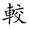 [①][jué][《廣韻》古岳切,入覺,見。][《廣韻》古孝切,去效,見。]“较1”的繁体字。(1)车箱两旁板上的横木。(2)指车厢。(3)直。(4)谓专略其利。参见“較固”。(5)法。(6)通“角”。竞逐。[②][jiào][《廣韻》古孝切,去效,見。]“较2”的繁体字。(1)较量,比本领。(2)明显,显著。(3)概略;大旨。(4)计量;比较。(5)计较。(6)相差。(7)痊愈。(8)数学上旧指用减法求得的馀数。(9)副词。表程度,约相当于“略”、“稍”。(10)介词。用于两种事物的比较,相当于“比”。(11)用同“校1”。考核;检验。(12)用同“校1”。校勘,校订。(13)用同“校1”。计算;计数。(14)用同“校1”。校官。参见“較2尉”。[③][xiào]“较3”的繁体字。同“校2”。学校。