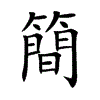 [①][jiǎn][《廣韻》古限切,上産,見。]“简1”的繁体字。亦作“1”。(1)古代用以写字的竹片。亦指功用与简相同的书写用品。(2)书籍;书柬。(3)谓寄送书简。(4)简省;简易;简单。(5)轻贱;怠慢。(6)怠惰;苟且。(7)稀少。(8)检阅;视察。(9)指操练。参见“簡服”。(10)检查;检验。(11)核实;符合事实。(12)寻捡。(13)选择;选用。(14)承受。(15)捐弃;剔除。(16)分别;辨别。(17)大。(18)笏;手版。(19)打击乐器名。(20)鞭类兵器名。后多写作“鐧”。(21)同“籣”。古代盛弩箭之器。(22)通“諫”。(23)在,存留。(24)勇猛貌;强劲貌。(25)量词。用于书信、柬帖。(26)水名。古黄河下游的支流,故道在今山东省阳信县、乐陵市境。(27)姓。周大夫有简师父。见《左传·僖公二十四年》。