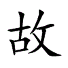 ⒋ 老,旧,过去的,原来的:故事(a.旧事,成例;b.有连贯性的比较完整的事情,比较适合于口头讲述,“事”读轻声)。故人。故乡。故土(故乡)。故园(故乡)。故居。故国(故乡,亦指祖国)。故纸堆(泛指旧而多的文籍)。革故鼎新(“革”,除去;“鼎”,更新;破除旧的,建立新的)。故步自封(“故步”,原来的步子;“封”,限制;喻安于现状,不求进取。亦作“固步自封”)。