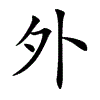 [①][wài][《廣韻》五會切,去泰,疑。](1)外面。与“内”或“裏”相对。(2)外表;仪表。(3)指外饰。(4)表面上。(5)越出,超出。(6)忘怀;超脱。(7)疏远;排斥。(8)谓见外,当外人看待。(9)抛弃;废置。(10)外诸侯国;外国。(11)外地;异乡。(12)外物。(13)谓视为外物。(14)指男子。《孟子·梁惠王下》:“當是時也,内無怨女,外無曠夫。”赵岐注:“普使一國男女,無有怨曠。”孙奭疏:“内無怨女,外無曠夫,皆男女嫁娶過時者,謂之怨女曠夫也。女生向内故云内,男生向外故云外。”杨伯峻注:“這裏内外係指男女而言。古代以女子居内,男子居外,所以這裏'怨女'用'内'字,'曠夫'用'外'字。”后世妇女称丈夫为外。南朝梁徐悱妻刘令娴有《答外诗》。见《玉台新咏》卷六。参见“外子”。亦指男宠,男色。(15)指吏役人等。(16)称母亲、妻子、姐妹及女儿方面的亲属为外。参见“外戚”、“外祖”、“外甥”等。(17)指外廷臣僚。(18)指地方官。亦谓京官调任地方官。(19)以外。(20)以前。(21)另外。(22)用在数量词之后,表示有零头。(23)异;不一。参见“外心”。(24)非正式的,非正规的。(25)特指八卦卦位的上位。(26)佛教称其他宗教、思想为外,自称为内。参见“外道”。(27)传统戏曲角色名。元代戏曲中有外末、外旦、外净等,大致是指末、旦、净等行当的次要脚色。明清以来,“外”逐渐成为专演老年男子的脚色。