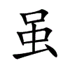 [①][suī][《廣韻》息遺切,平脂,心。]“虽1”的繁体字。(1)虫名。一种有花纹的大蜥蜴。(2)连词。表示让步关系。犹虽然。(3)连词。表示假设关系。相当于“縱然”、“即使”。(4)通“唯”。副词。唯有,只有。(5)通“唯”。语首助词。(6)通“須”。副词。本,本来。[②][wèi]“虽2”的繁体字。通“蜼1”。兽名。
